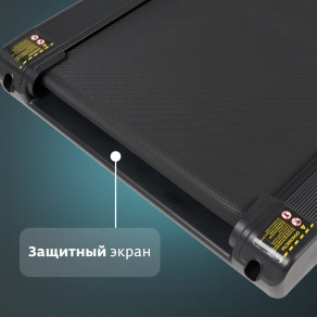 Полотно плавно опускается при помощи встроенного амортизатора. Защитный экран, расположенный сразу за задним роликом бегового полотна, защитит детей и домашних питомцев от травм. Отсутствие кожуха двигателя спереди делает тренировку более безопасной: вы не заденете его ногой при беге.