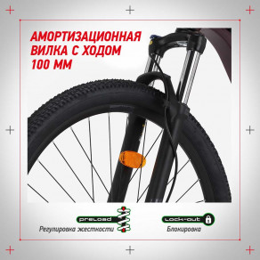 Амортизационная вилка с ходом 100 мм, регулировкой жесткости Preload и блокировкой.