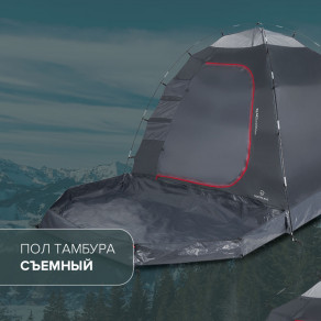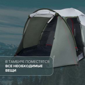 Трехместная комфортная кемпинговая палатка с дополнительной выносной дугой для тамбура — идеальный вариант для семейного отдыха и длительных походов. Темная внутренняя палатка и широкие спальные места размером до 70 см позволят с комфортом отдохнуть даже в светлое время суток.