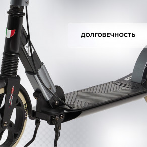 Недостатки1) короткое основание, длина которого меньше заявленных 57см из-за странного крепления стойки рулевой к деке. Замок съедает значительное пространство, и крыло сзади тоже. Короче, если вы большой дядя с размером ноги 44+, то вторую ногу даже на носок поставить не сможете. 2) Конструкция замка для складывания руля ужасная. Если регулировочный винт не затягивать, то все работает хорошо, складывается легко, но люфт ужасный рулевой стойки в месте защёлкивание замка. Если винт закрутить, люфта нет, но замок руками открыть невозможно. Приходится возить с собой шестигранник, чтобы при необходимости сложить самокат, ослабив винт. 3) подножка на любителя, по-моему неудобная и громоздкая. 4) тормоз чисто номинальный, можно считать, что его нет, и диск из коробки немного кривой, пришлось увеличивать зазоры, чтобы не задевал о колодки. 5) не хватает высоты руля, если рост около 190. История индивидуальная, но может кому будет полезно. Мне бы хотелось еще 5-7см плюсом. 6) на заднем крыле есть брызговик, он всем хорош, но болтается, может вылететь, нужно подмотать синей изолентой.