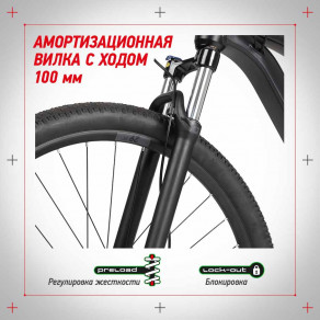 Амортизационная вилка с ходом 100 мм и регулировкой жесткости Preload — отличный вариант для загородных маршрутов: она эффективно смягчает удары и вибрации. На ровной дороге или при подъеме в гору вилку можно заблокировать, чтобы тратить меньше сил.