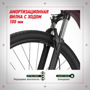 Амортизационная вилка с ходом 100 мм — то что нужно для загородных велопутешествий. Она эффективно снижает вибрации и удары на неровной дороге. А на ровном участке или при подъеме в гору сэкономить силы поможет регулировка жесткости Preload и возможность заблокировать ход вилки.