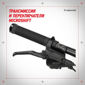 Трансмиссия и переключатели Microshift обеспечат точную смену 8 скоростей. Можно выбрать оптимальный режим для спусков, подъемов, ровной и неровной дороги.