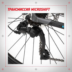 Трансмиссия Microshift обеспечит точное и плавное переключение 21 скорости. Можно выбрать оптимальный режим для спусков, подъемов, ровной и неровной дороги.