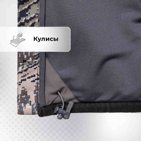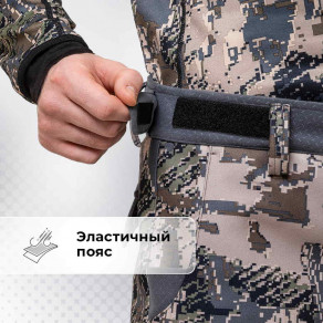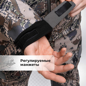 Регулируемые элементы — кулисы, манжеты, эластичный пояс — помогут подогнать костюм по фигуре и не дадут холодному воздуху попасть под одежду. Капюшон с регулировкой объема защищает от дождя и ветра и при этом не ограничивает обзор.